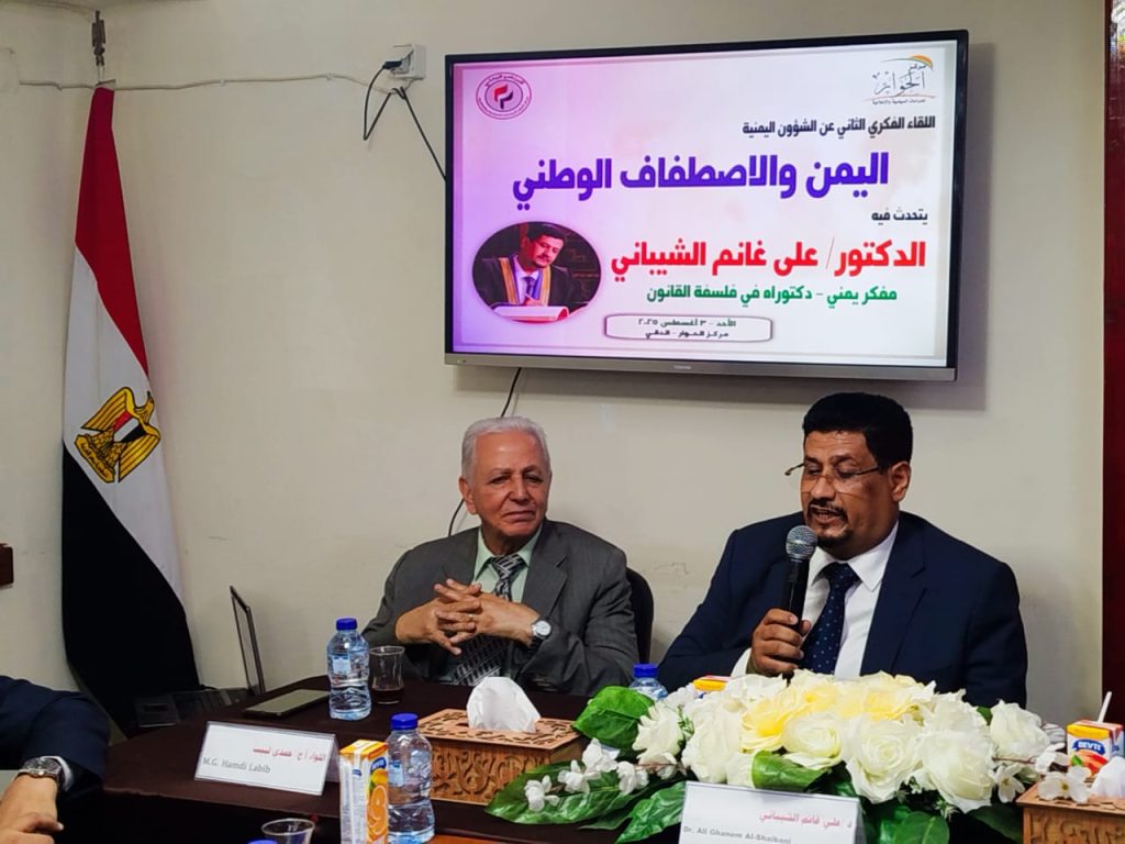 عقد برنامج الشؤون اليمنية بمركز الحوار للدراسات السياسية والإعلامية لقاء فكريًا حول الاصطفاف الوطني في اليمن، بحضور نخبة من المفكرين والباحثين المختصين بالشأن اليمني، حيث أكد اللواء أ.ح حمدي لبيب رئيس مؤسسة الحوار للدراسات والبحوث الإنسانية خلال كلمته الافتتاحية على أهمية الاصطفاف الوطني في اليمن كأساس للحل الأزمة اليمنية موضحًا أن يجب تعزيز قيم الهوية والوطنية والانتماء.