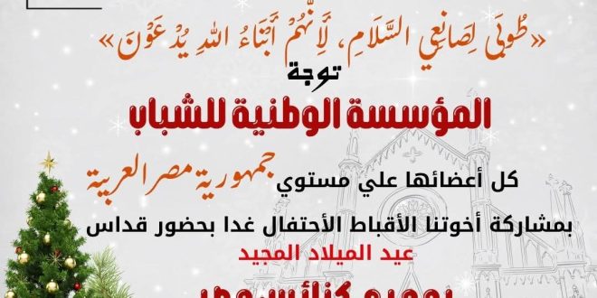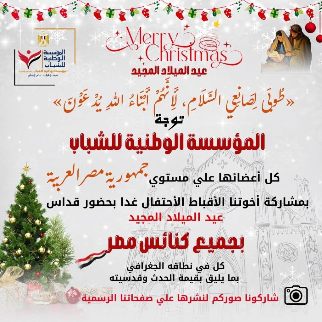 في ضوء توجيهات فخامة الرئيس عبد الفتاح السيسي بتوحيد الصف الوطني وتعزيز قيم المواطنة، أعلنت المؤسسة الوطنية للشباب توجيهها لكافة أعضائها على مستوى جمهورية مصر العربية للمشاركة في احتفالات عيد الميلاد المجيد، من خلال التواجد بالكنائس كلٌّ في نطاقه الجغرافي، وبما يليق بقدسية المناسبة.