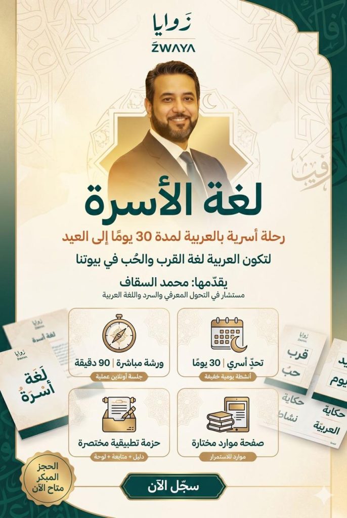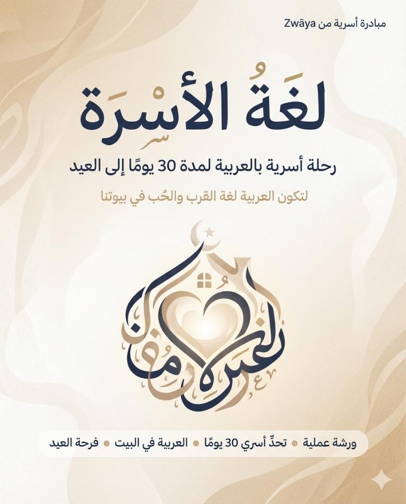 منصة “زوايا” (ZWAYA)، أعلنت إطلاق مبادرتها الجديدة بعنوان “لغة الأسرة”، وهي رحلة معرفية تفاعلية تمتد لمدة 30 يوما وتستمر حتى حلول عيد الفطر المبارك.